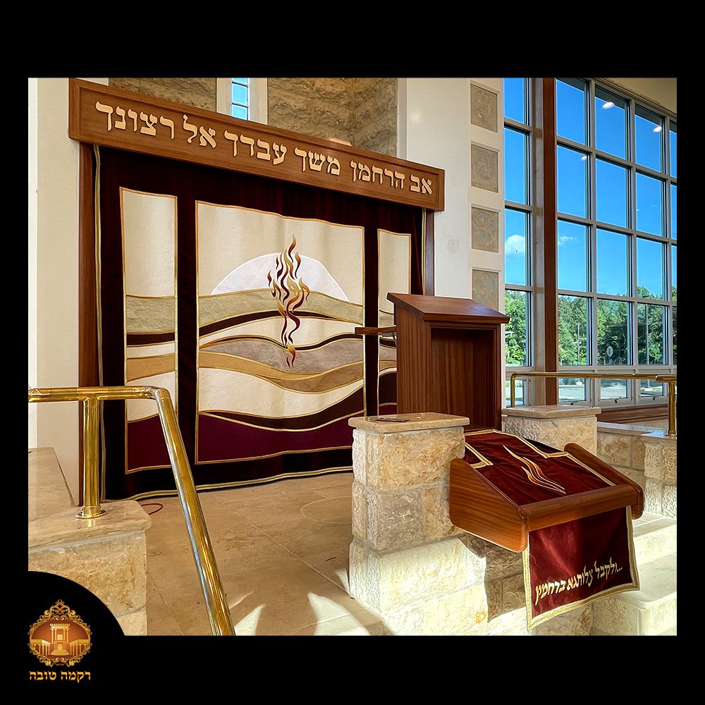 פרוכת בעיצוב אפליקציות אומנותי, שילוב בדים נאים ורמת גוונים המעשירה את המראה ויוצרת מעברים אומנותיים